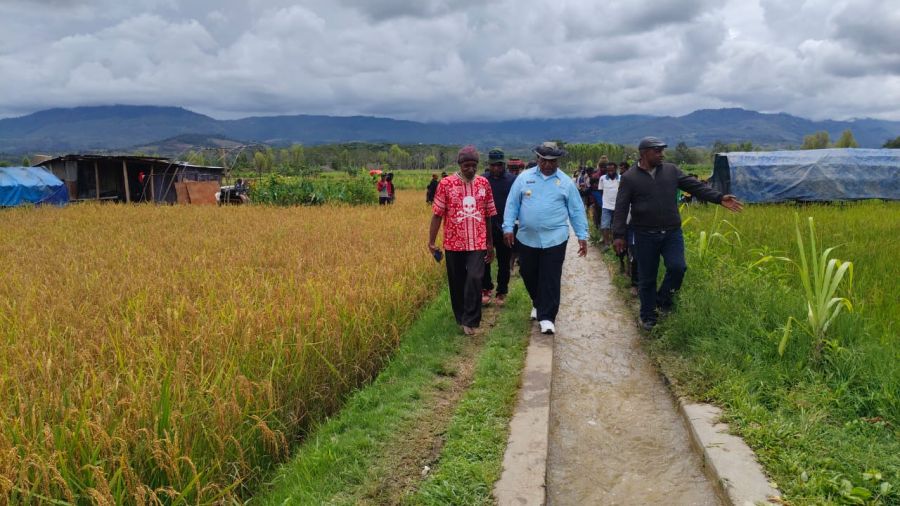 Bupati Jayawijaya Atenius M urip, didampingi beberapa pimpinan OPD saat melihat persawahan di Distrik Hubikosi, Kamis (30/10/2025).