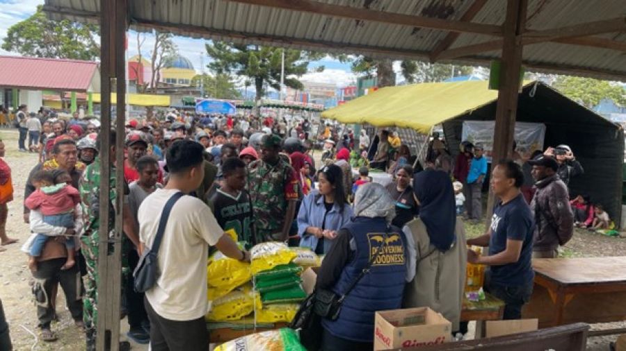 Ratusan Warga Kota Wamena memenuhi halaman Koramil Wamena kota Untuk mendapatkan sembako dibawah harga pasar dalam Gerakan Pangan Murahn (GPM) yang dilakukan Pemkab Jayawijaya dan Bulog Wamena.